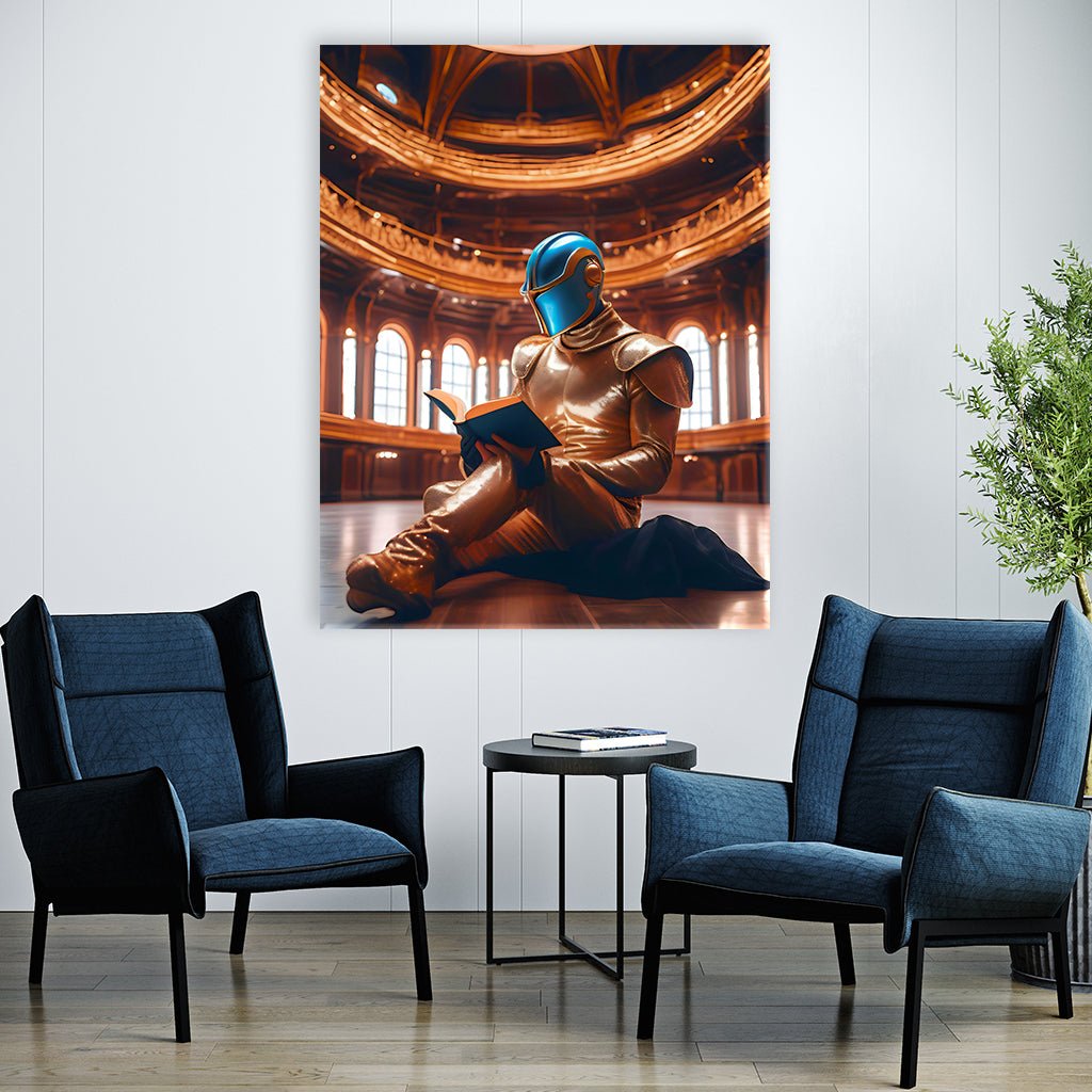 A man in a shiny gold suit and a striking blue helmet sits on the floor of the theater's grandstand, engrossed in a book. The magnificent architecture of the theater unfolds in the background, with the elegant rows of seats. The entire color scheme of the picture is dominated by gold, which means that the man and his costume are harmoniously embedded in the luxurious atmosphere of the theater.
