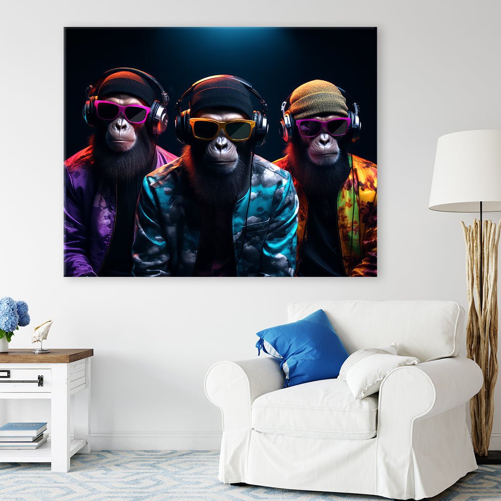 Three stylish monkeys next to each other, with the one in the middle protruding slightly forward. All three wear cool sunglasses, headphones and colorful jackets, against a dark background. An unusual and casual motif that expresses the coolness and style of these monkeys. An awesome eye-catcher on the wall in the bedroom or living room.