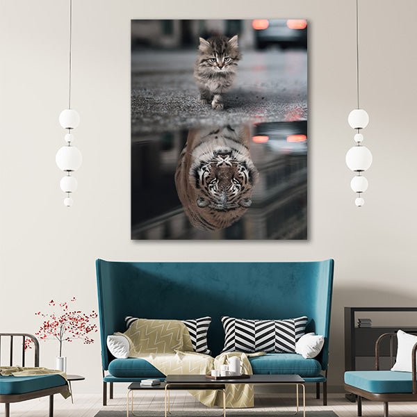 In this mesmerizing image, a cute cat stands in front of a puddle while a majestic tiger can be seen in its reflection. This powerful metaphor reminds us that our mindset shapes our reality and that we are often more than we give ourselves credit for. The image is perfect for anyone who wants to be inspired to reach their full potential and align their mindset towards success and growth.