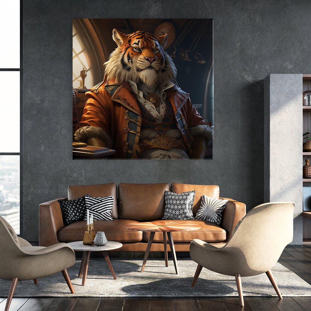 A massive tiger, proud and fierce, perches on a massive chair, wrapped in a pirate outfit made of sturdy leather. His gaze is dark, an aura of power and determination surrounds him. As a pirate of the seas, he dominates the kingdom of the waves and presents his kingdom in a penetrating way.