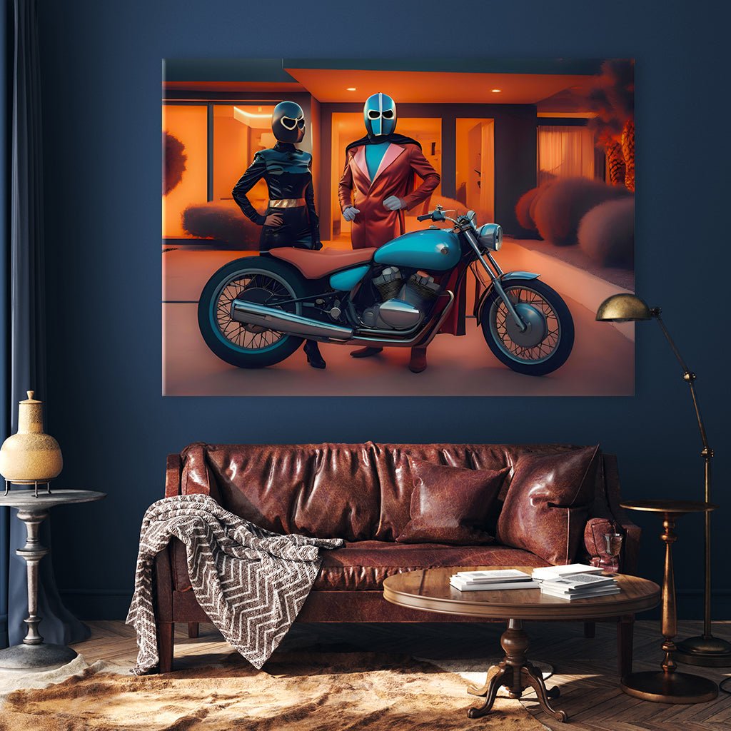 A couple in shiny galactic suits and futuristic helmets stand behind a sleek, futuristic motorcycle. Their suits reflect the light in metallic tones as they stare determinedly into the distance. Behind them rises a futuristic house with flowing, modern shapes and glowing, energetic colors that fit perfectly into the vision of a progressive future.