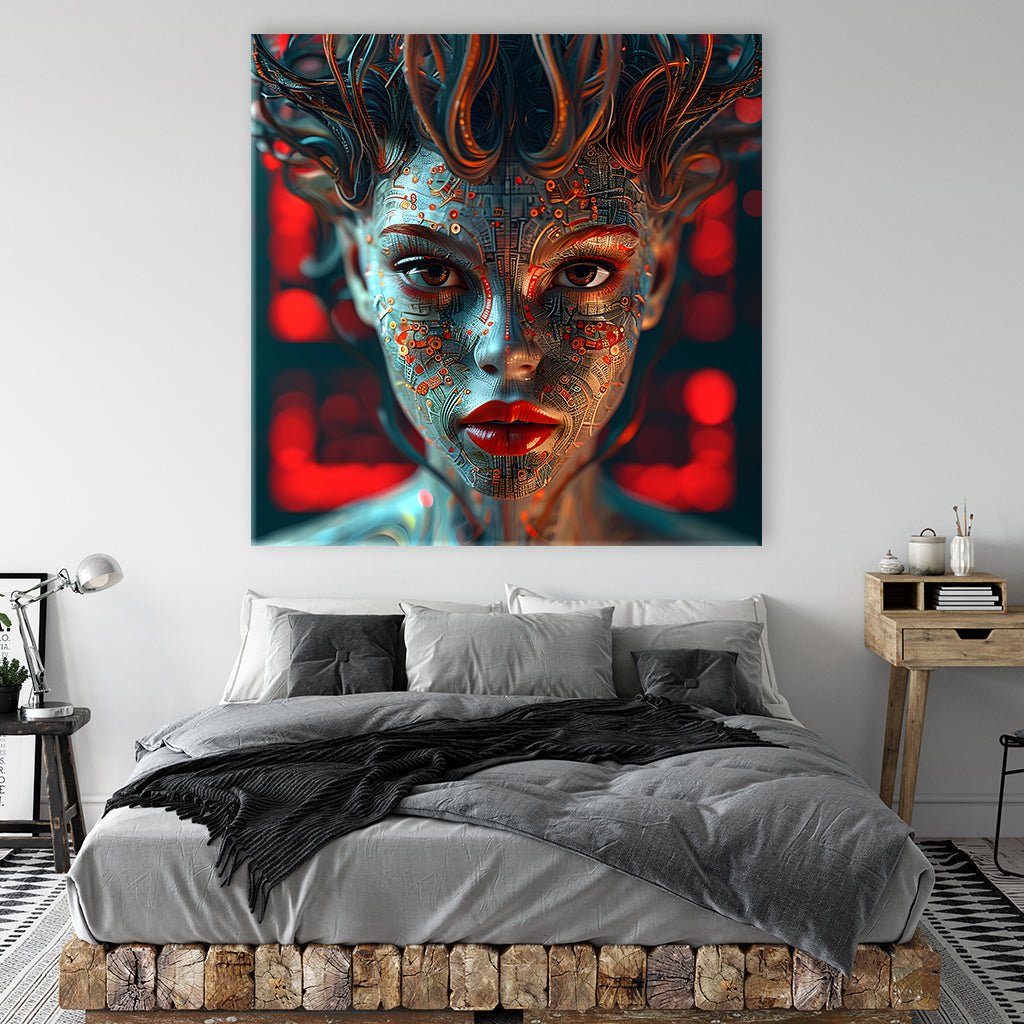 The image shows a face fused with futuristic, technological elements. Complex circuits and patterns are etched into the skin. The hair is a swirling mass of dark, metallic threads. The background is dark with red lights, creating a mysterious and futuristic atmosphere.