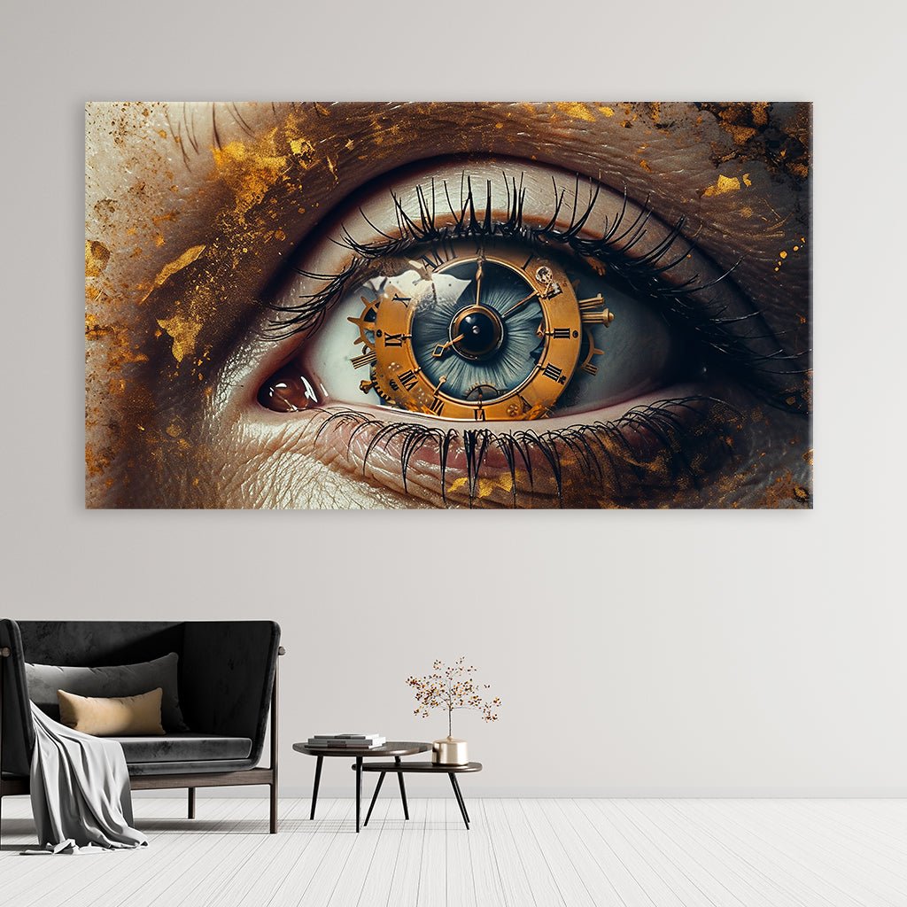 A mesmerizing close-up reveals an eye whose iris reveals a nostalgic clockwork mechanism. The artistic mechanics create a nostalgic atmosphere. It symbolizes time that moves forward unceasingly. This unique composition of eye and clockwork captivates the viewer and awakens the longing for bygone times and to always keep an eye on them.