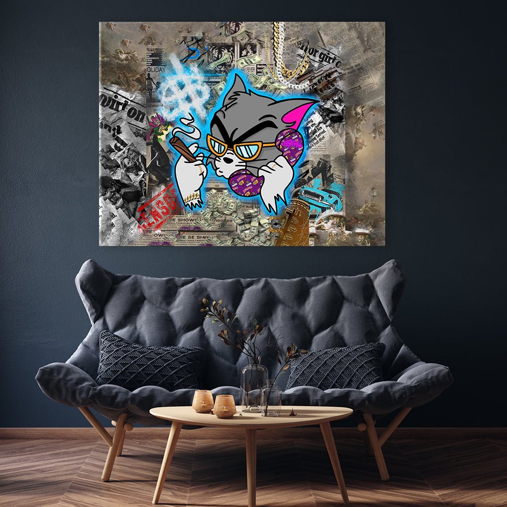 Tom, known from "Tom and Jerry", shows himself here as a capable business cat. On the phone and with a cigar in his paw, he exudes nonchalance. The smoke forms dollar signs in the air. Gold chains and newspaper articles celebrating his successes shine in the background.