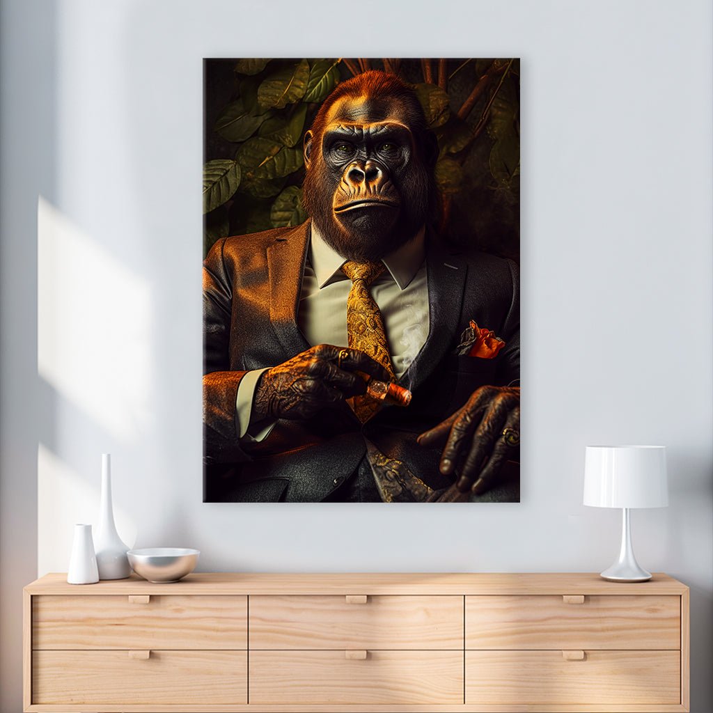 A gorilla in a smart business outfit with a determined expression and posture. A cigar in his hand. This scene exudes elegance and power at the same time as the gorilla enjoys. The image is a play between the wildness of nature and the sophistication of human style.