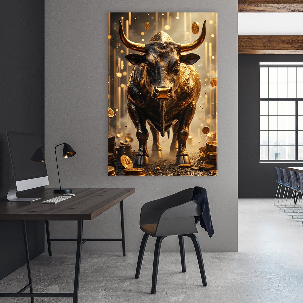 This powerful image depicts a massive, dark bull that appears to be charging directly toward the viewer. Its golden skin glistens in the light, and golden horns rise menacingly. Scattered in the background are golden coins and particles, conveying an aura of wealth and power. The dynamic perspective and intense color scheme create an impressive and captivating scene.