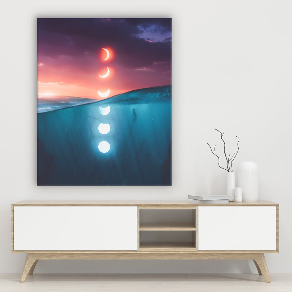 The different phases of the moon between sky and sea. The perfect eye-catcher for your living room, hallway, bedroom or office.
