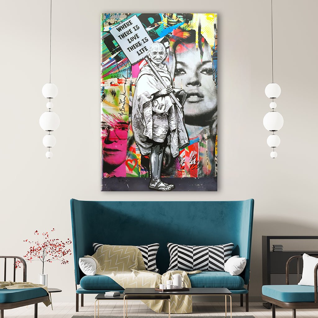 This motif in stencil technique shows Mahatma Gandhi with a sign in his arms on which his famous phrase "Where there is love, there is life" is written. Love is the fuel that gives us life, hope and strength.