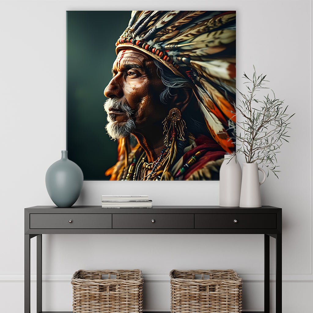The image shows a close-up of an elderly man with gray hair and a beard. He wears a traditional headdress with feathers and beads that frames his face. He has a serious, thoughtful expression and is looking to the side. A dark, blurred environment can be seen in the background. The image has an artistic and slightly dramatic character.